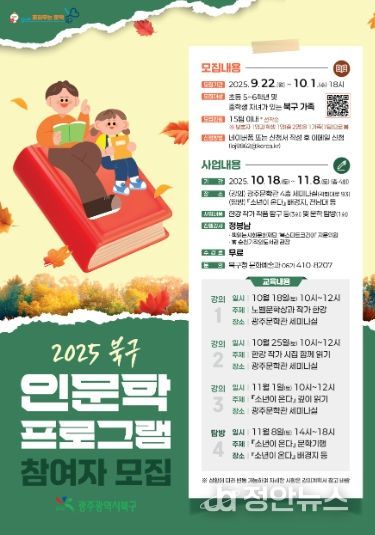 문인 북구청장은 “이번 프로그램이 문학을 읽고 사유하며 인문학의 소중한 가치를 체감하는 계기가 되기를 바란다”며 “앞으로도 문화 향유 기회 확대를 위해 체감도 높은 정책을 펼쳐 나가겠다”고 말했다.