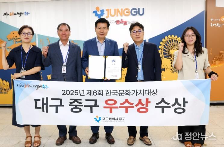 정안뉴스 안정주 기자 | 대구 중구는 (사)한국문화가치연구협회가 주관한 ‘2025년 제6회 한국문화가치대상’에서 우수상을 받았다고 밝혔다.