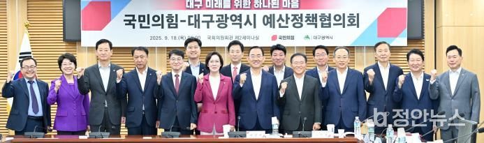 정안뉴스 안정주 기자 | 대구광역시와 국민의힘은 9월 18일 국회에서 예산정책협의회를 열고, 내년도 주요 국비사업의 정부예산 최종 반영과 TK신공항 건설·취수원 이전 등 핵심 현안의 성공적 추진 방안을 논의했다.