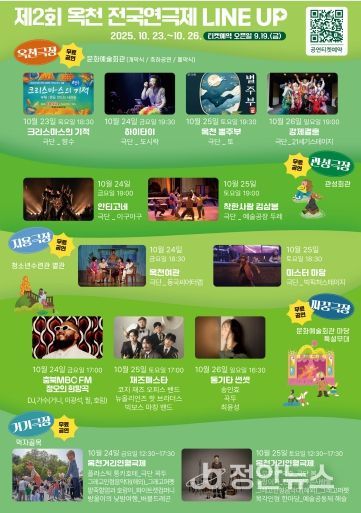 올해 연극제는 작품 공모로 선정한 5편, 초청 및 지역 작품 4편, 인형극 8편과 축하 공연 등 풍성한 공연으로 관객에게 웃음과 감동을 선사할 예정이다. 특히, 작품 공모에는 전국 58개 극단이 참여해 11대 1의 높은 경쟁률을 기록하며 옥천 전국연극제가 한국 연극의 대표 축제로 자리 잡았음을 확인시켰다.