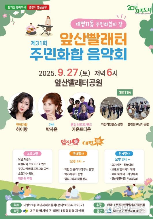정안뉴스 안정주 기자 | 대구 남구 대명11동 행정복지센터는 주민과 함께하는 문화축제로 오는 9월 27일 오후 6시에 앞산빨래터공원에서 ‘제31회 앞산빨래터 주민화합 음악회’를 개최한다.