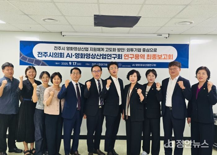 정안뉴스 안정주 기자 | 전주시의회는 지난 17일 의원 연구단체인 AI·영화영상산업연구회가 전주시정연구원에서 연구용역 최종보고회를 열고, 글로벌 영화사 유치 전략에 대해 논의했다고 18일 밝혔다.