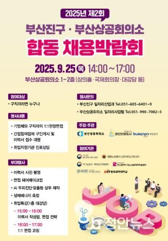 정안뉴스 황정혜 기자 | 부산 부산진구는 오는 25일 오후 2시, 부산상공회의소 1·2층(대강당, 상의홀 등)에서 ‘2025년 제2회 부산진구·부산상공회의소 합동 채용박람회’를 개최한다고 밝혔다.
