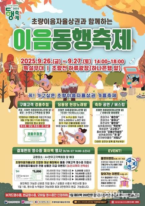 정안뉴스 황정혜 기자 | 부산 초량이음자율상권조합은 9월 전국 동행축제 기간에 맞춰 오는 9월 26일 부터 27일 양일간 초량이음자율상권 구역 내에서 “이음동행축제”를 연다고 밝혔다.