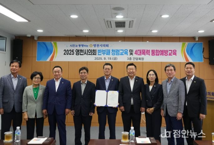 정안뉴스 안정주 기자 | 영천시의회는 지난 19일 의회 간담회장에서 시의원 전체를 대상으로 반부패·청렴교육 및 4대 폭력예방 통합교육을 실시했다.