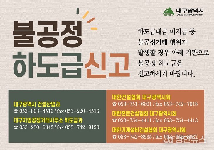 아울러 대구시는 9월 15일부터 10월 2일까지 ‘불공정하도급 신고센터’를 집중 운영하고 홍보 유인물(스티커)을 배포하는 등 하도급대금 체불 및 지연 지급과 같은 불공정행위 예방에 최선을 다할 예정이다.