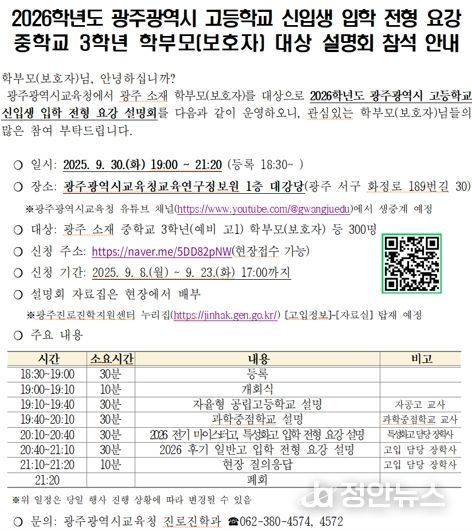 정안뉴스 안정주 기자 | 광주시교육청은 오는 30일 오후 7시 광주시교육청교육연구정보원 대강당에서 중학교 3학년 학생과 학부모를 대상으로 ‘고입 전형요강 설명회’를 개최한다.