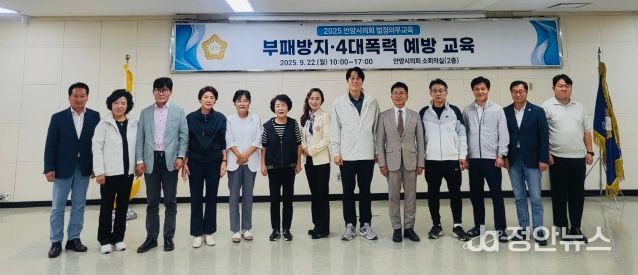 정안뉴스 안정주 기자 | 안양시의회는 지난 22일 시의회 소회의실에서 시의원과 사무국 직원을 대상으로 ‘부패방지 및 4대폭력 예방 교육’을 진행했다. 이번 교육은 법정의무교육으로, 청렴 의식 함양과 4대폭력(성희롱, 성폭력, 성매매, 가정폭력)에 대한 예방 의식 고취를 위해 마련됐다.