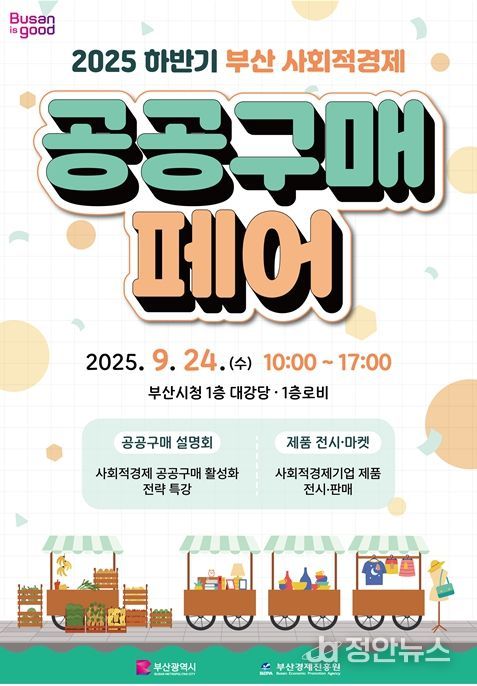 정안뉴스 황정혜 기자 | 부산시는 내일(24일) 오전 10시 시청 1층 대강당과 로비에서 '2025 하반기 부산 사회적경제 공공구매 페어'를 개최한다고 밝혔다.