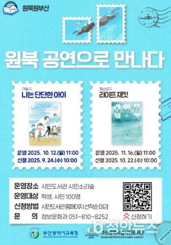 정안뉴스 황정혜 기자 | 부산광역시립시민도서관은 오는 10월 12일과 11월 16일 오전 11시에 시민도서관 시민소리숲에서 어린이와 청소년 100명을 대상으로 ‘원북 공연으로 만나다’ 공연을 펼친다.