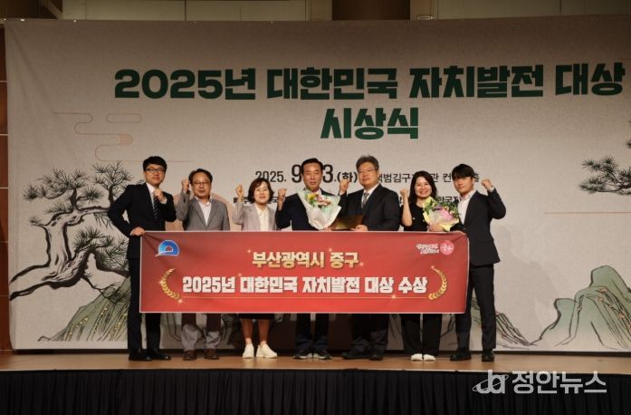 정안뉴스 황정혜 기자 | 부산 중구는 지난 23일 열린‘2025 대한민국 자치발전 대상’시상식에서 기초자치단체 부문 수상의 영예를 안았다.