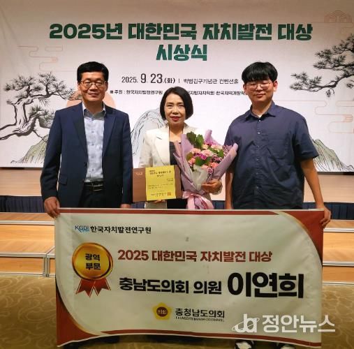 정안뉴스 황도연 기자 | 충남도의회 이연희 의원(서산3·국민의힘)이 23일 백범 김구 기념관에서 열린 '2025년 대한민국 자치발전 대상' 시상식에서 광역의회 의원부문 수상자로 선정됐다.