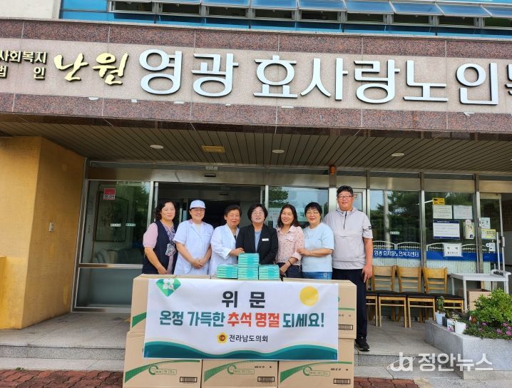 정안뉴스 안정주 기자 | 전라남도의회 오미화(진보당·영광2) 의원이 추석 명절을 앞둔 9월 24일, 영광군 법성면 ‘영광효사랑노인복지센터’를 방문해 어르신들과 종사자들을 격려하고 위문품을 전달했다.