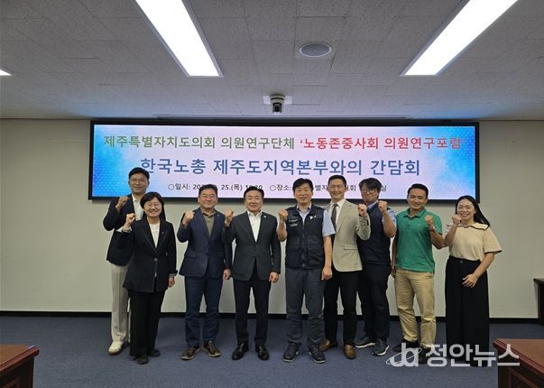 정안뉴스 안정주 기자 | 제주특별자치도의회 의원연구단체 ‘제주 노동존중사회 의원연구포럼’(대표의원 양경호)은 2025년 후반기 제주지역 노동현안 간담회의 세번째, 네번째 간담회로 제주특별자치도공무직노동조합과 한국노총제주도지역본부와 공식 간담회를 갖고, 현장 노동자들의 목소리를 직접 듣고 정책적 대응 방향을 모색했다.