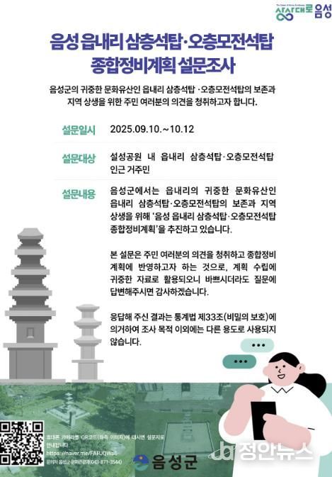 정안뉴스 황은경 기자 | 음성군은 읍내리 설성공원 일원에 위치한 ‘음성 읍내리 삼층석탑’ 및 ‘음성 읍내리 오층모전석탑’의 종합정비계획을 수립하는 과정에서 주민 의견 수렴을 위한 온라인 설문조사를 실시한다고 밝혔다.