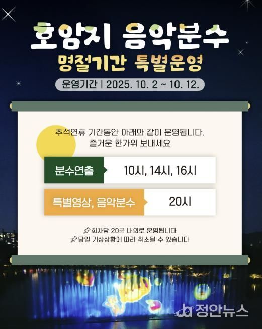 정안뉴스 황은경 기자 | 충주시는 도심 속 이색 명소로 자리매김한 호암지 음악분수의 가을철 운영 일정을 조정해 시민과 관광객들에게 한층 다채로운 볼거리를 제공한다고 밝혔다.