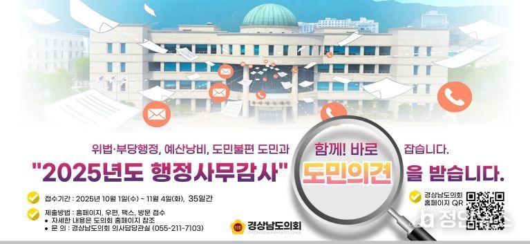 정안뉴스 안정주 기자 | 경상남도의회는 11월 5일부터 18일, 14일간 예정되어 있는 ‘2025년도 행정사무감사’를 앞두고 도민의 의견을 받는다고 밝혔다.
