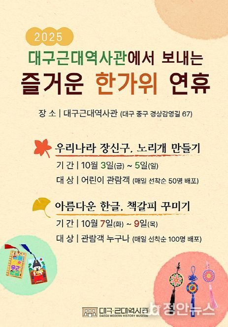 정안뉴스 안정주 기자 | (재)대구문화예술진흥원 박물관운영본부 소속 3개 공립박물관인 대구근대역사관·대구방짜유기박물관·대구향토역사관에서는 2025년 추석 연휴(10.3.~9.) 동안 관람객을 대상으로 다채로운 문화행사를 개최한다.