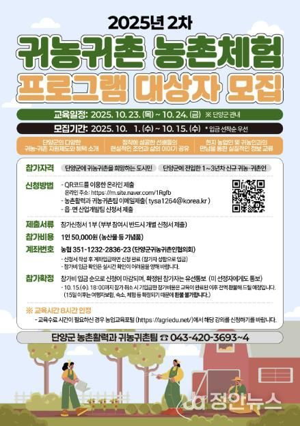 군 관계자는 “이번 프로그램은 농촌의 삶을 직접 체험하면서 귀농·귀촌 정책과 정착 정보를 함께 얻을 수 있는 기회”라며 “예비 귀농귀촌인들이 단양에서 새로운 미래를 설계할 수 있도록 많은 관심과 참여를 바란다”고 말했다.