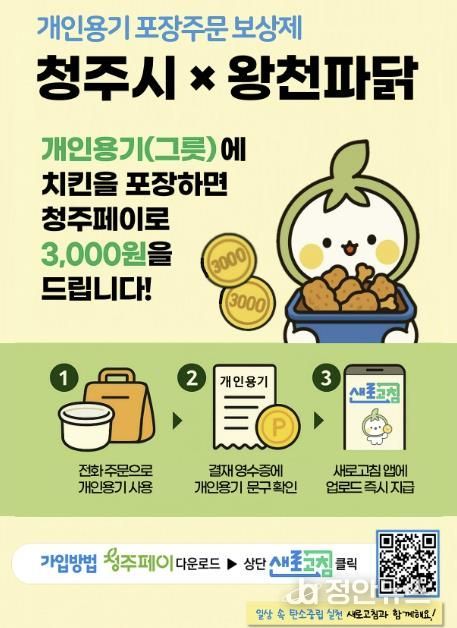 정안뉴스 황은경 기자 | 청주시는 10월 1일부터 ‘새로고침’ 모바일앱을 통해 전국 최초 개인용기 포장주문 보상제를 시행한다. 참여자에게는 지역화폐인 청주사랑상품권(청주페이) 3천원이 보상으로 지급된다.