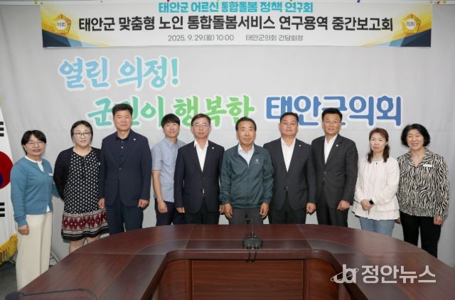 정안뉴스 황도연 기자 | 태안군의회 의원연구단체 ‘태안군 어르신 통합돌봄 정책 연구회’는 9월 29일 오전 10시, 태안군의회 간담회장에서 '태안군 맞춤형 노인 통합돌봄서비스 정책 연구' 중간보고회를 개최했다.