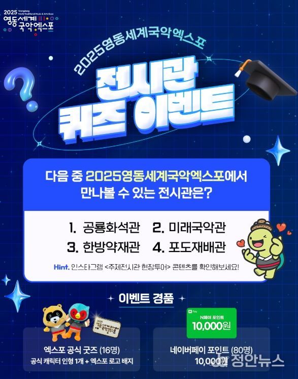 이번 이벤트는 2025영동세계국악엑스포(이하 ‘국악엑스포’)에서만 만나볼 수 있는 3개의 주제전시관 중 하나의 이름을 맞히는 퀴즈 형식으로, '주제전시관 현장투어' 콘텐츠에서 정답에 대한 힌트를 얻을 수 있다.
