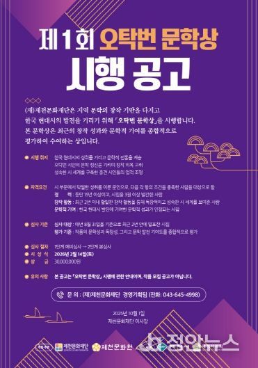 정안뉴스 황은경 기자 | (재)제천문화재단(이사장 김상수)은 지역 문학의 창작 기반을 다지고 한국 현대시의 발전을 기리기 위해 제천문화재단 제1회'오탁번 문학상'을 공고했다. 이번 문학상은 최근의 창작 성과와 문학적 기여를 종합적으로 평가하여 수여하는 상으로, 오탁번 시인의 문학 정신을 기리고 문학적 전통을 계승하는데 그 취지가 있다.