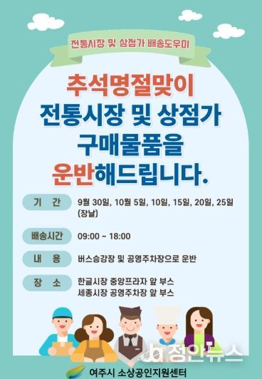 정안뉴스 안정주 기자 | 여주시는 여주시소상공인지원센터 주관으로 다가오는 추석 명절을 맞이하여 전통시장과 상점가를 찾는 시민들의 편의를 돕고 전통시장 활성화를 위해 ‘전통시장 및 상점가 배송 도우미’ 서비스를 운영한다.