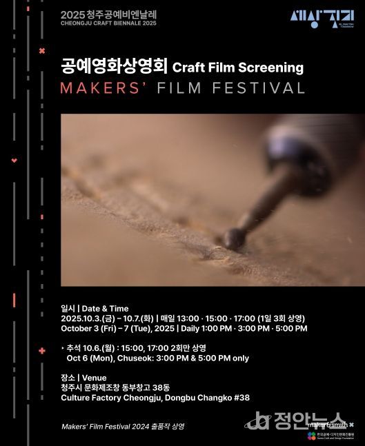 정안뉴스 황은경 기자 | 청주공예비엔날레조직위원회는 10월 3일부터 7일까지 닷새간 문화제조창 동부창고 38동에서 추석 특별 공예영화상영회를 연다.