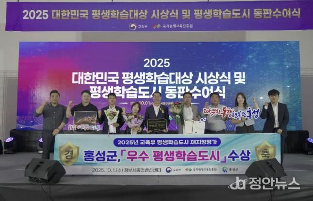 정안뉴스 황도연 기자 | 홍성군은 지난 1일 정부세종컨벤션센터에서 열린 ‘2025 대한민국 평생학습대상 및 평생학습도시 동판수여식’에서 교육부장관 기관표창을 수상하며, 전국 평생학습 활성화를 선도하는 도시로 위상을 높였다.