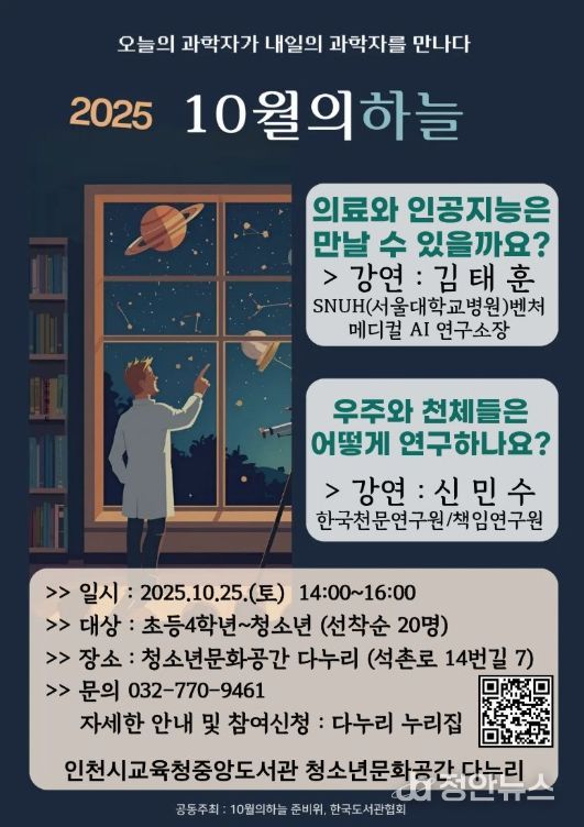 정안뉴스 안정주 기자 | 인천광역시교육청중앙도서관 청소년문화공간 다누리는 10월 25일 토요일 오후 2시 청소년을 대상으로 과학자들의 재능기부 강연 프로그램 ‘10월의 하늘’을 개최한다.