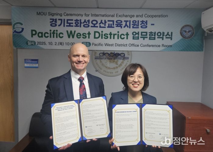 정안뉴스 안정주 기자 | 화성오산교육지원청은 10월 2일 미국방부교육청 대회의실에서 미국 Pacific West District와 국제교류협력 업무협약(MOU)을 맺고, 학생 맞춤형 글로벌 교육 프로그램을 본격적으로 추진한다.