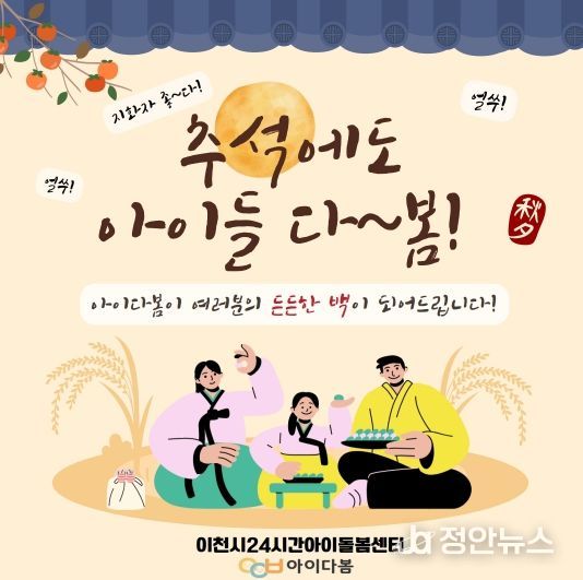 정안뉴스 안정주 기자 | 이천시는 추석 연휴 기간에도 이천시 24시간 아이돌봄센터인 ‘아이다봄’을 365일 24시간 정상 운영해 연휴 중 발생할 수 있는 돌봄 공백을 최소화한다고 밝혔다.