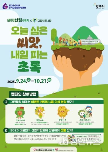 정안뉴스 안정주 기자 | (사)광주시자원봉사센터는 오는 9월 24일부터 10월 21일까지 '오늘 심은 씨앗, 내일 피는 초록' 캠페인을 운영하고 있다. 이번 캠페인은 온라인 참여와 현장 체험을 아우르는 시민 참여형 환경 프로그램으로, 제16회 2025 대한민국 산림박람회(10.18~21, 곤지암 도자공원)와 연계해 진행된다.