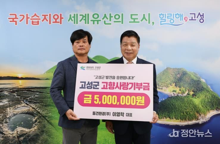 정안뉴스 김재홍 기자 | 고성군은 11월 7일, 동건환경(주) 이영학 대표가 2024년에 이어 올해에도 고향사랑기부금을 500만 원을 기탁했다고 밝혔다.