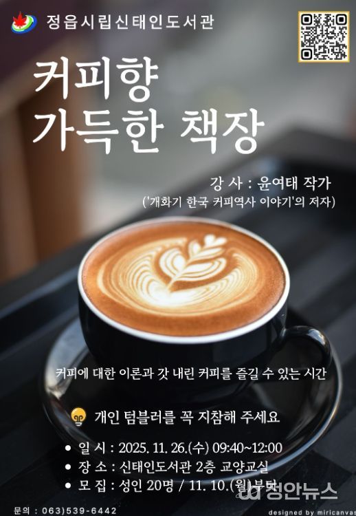 신태인도서관 관계자는 “평소 즐겨 마시는 커피의 종류와 그 이면에 담긴 역사를 배우는 유익한 시간이 될 것”이라며 “아름다운 정읍의 가을 풍경 속에서 도서관을 찾은 시민들이 책과 함께 커피 향을 음미하며 힐링하는 시간이 되길 바란다”고 전했다.