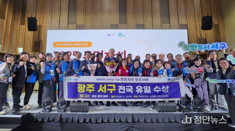 정안뉴스 안정주 기자 | 광주광역시 서구가 마을 중심의 자치행정을 실현한 성과를 인정받아 행정안전부가 주관한 지방자치 30주년 기념 공모전에서 전국 기초자치단체 중 유일하게 2관왕에 올랐다. 서구는 20일 울산전시컨벤션센터에서 열린 주민자치 우수사례 공모전에서 풍암동 BI사업(주민자치 분야)과 거점-연계동 협력 시스템(제도정책 분야) 두 개 분야에서 모두 행정안전부장관상을 수상하며 총 특별교부세 1억5천만원을 확보했다.