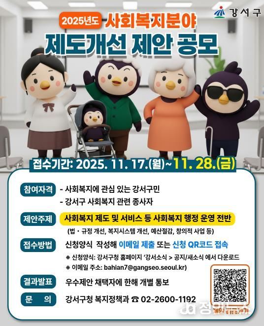 정안뉴스 안정주 기자 | 서울 강서구는 오는 28일까지 ‘2025년 사회복지분야 제도개선 제안 공모’를 진행한다고 밝혔다.