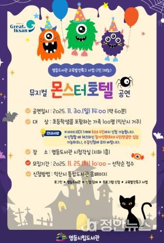 정안뉴스 안정주 기자 | 익산시는 오는 30일 오후 2시 영등도서관에서 어린이 뮤지컬 '몬스터 호텔'을 선보인다.