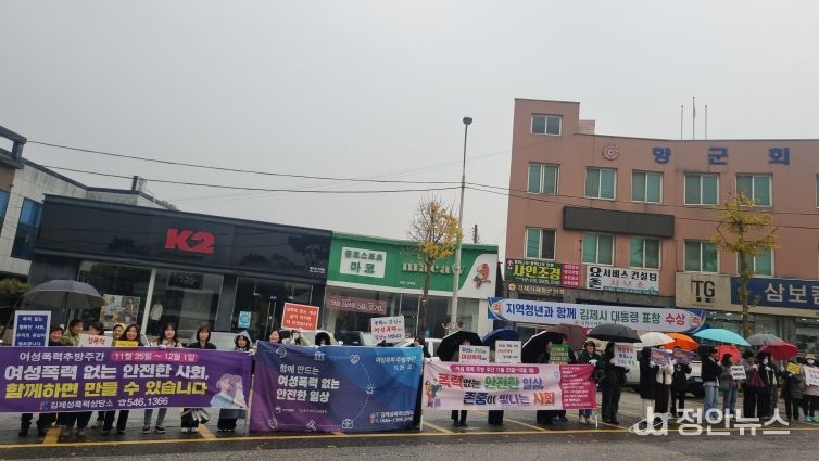 정안뉴스 안정주 기자 | 김제시는 25일 김제터미널 사거리에서 여성폭력 없는 사회를 위해 여성폭력 방지의 의미를 되새기며‘폭력 ZERO 사회’조성을 위한 범시민 대상 폭력예방 캠페인을 실시했다고 밝혔다.