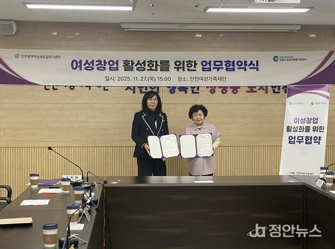 정안뉴스 안정주 기자 | 인천신용보증재단 인천소상공인종합지원센터와 인천여성가족재단 인천광역여성새로일하기센터는 '여성 창업 활성화를 위한 업무협약'을 체결했다고 27일 밝혔다.