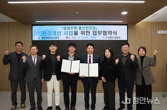 정안뉴스 안정주 기자 | 광주도시공사(사장 김승남)는 27일 빛고을고객센터에서 주식회사 케이티(광주지사장 김태오)과 함께 임대주택 통신인프라 환경개선을 위한 업무협약(MOU)을 체결했다.