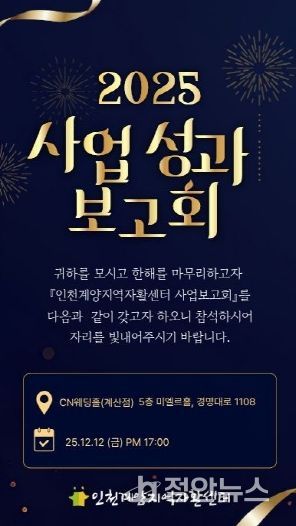 정안뉴스 안정주 기자 | 인천계양지역자활센터(센터장 한경주)는 2025년 한 해 동안 추진한 자활사업의 성과를 공유하고 참여주민을 격려하기 위해 ‘2025년 사업성과 보고회’를 오는 12월 12일 오후 5시 CN웨딩홀 계산점에서 개최한다고 밝혔다.