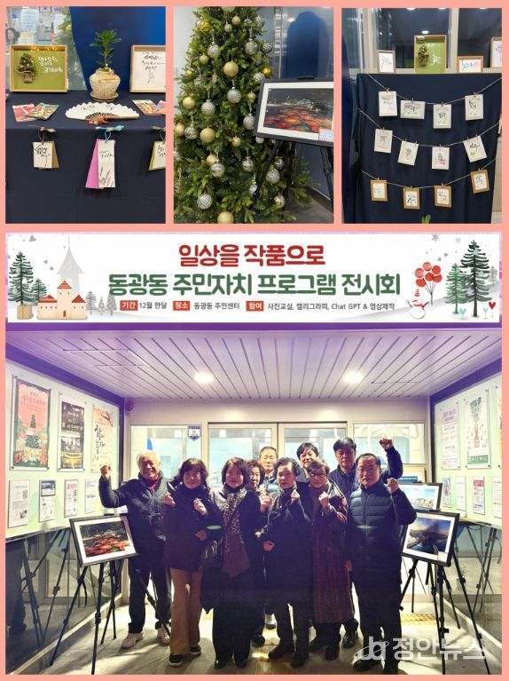이번 전시는 2025년 동광동 주민자치 프로그램인 Chat GPT · 영상제작교실, 사진교실, 캘리그라피 교실 수강생들의 빛나는 작품들로 풍성하게 구성됐다.