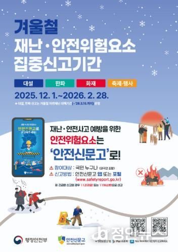 신고기간은 2025년 12월 1일부터 2026년 2월 28일까지로, 군민 누구나 ‘안전신문고’ 앱과 포털사이트를 통해 간편하게 신고할 수 있다.