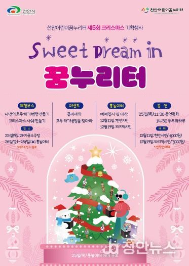 정안뉴스 황도연 기자 | 천안어린이꿈누리터(관장 조삼혁)는 오는 12월 25일부터 28일까지 제5회 크리스마스 기획행사‘Sweet Dream in 꿈누리터’를 진행한다고 밝혔다.