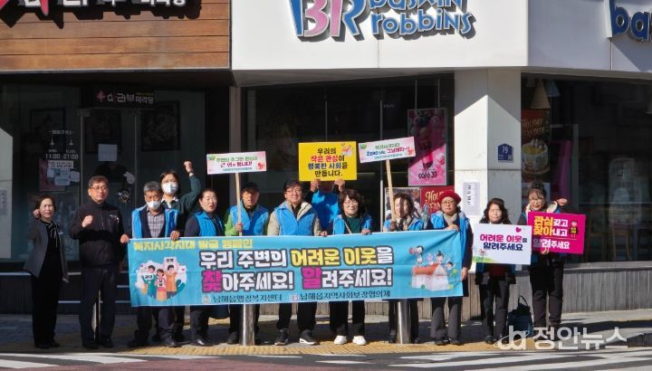 정안뉴스 김재홍 기자 | 남해읍 지역사회보장협의체(공동위원장: 이창융, 박근배)는 지난 18일 남해읍행정복지센터 회의실에서 2025년 12월 정기회의를 개최한 후 읍 사거리에서 복지사각지대 발굴 캠페인을 개최했다.