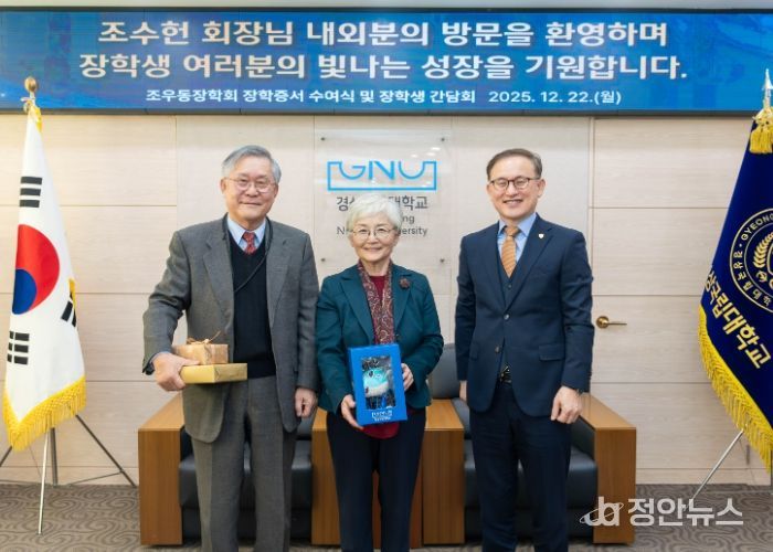경상국립대학교는 12월 22일 오전 11시 가좌캠퍼스 대학본부 접견실에서 ‘2025학년도 2학기 조우동장학회 장학증서 수여식’을 개최했다.