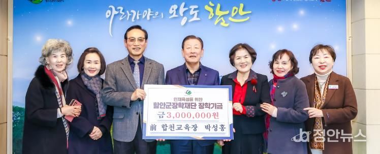 정안뉴스 김재홍 기자 | 함안군은 법수면 황사리 출신의 박성홍 전 합천교육장이 고향 인재 육성을 위한 장학기금 300만 원을 기탁했다고 밝혔다.