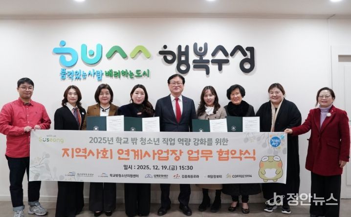 정안뉴스 안정주 기자 | 대구 수성구는 지난 19일 학교밖청소년의 직업 역량 강화를 위한 지역사회 연계사업 추진을 위해 관련 기관과 업무협약을 체결했다.